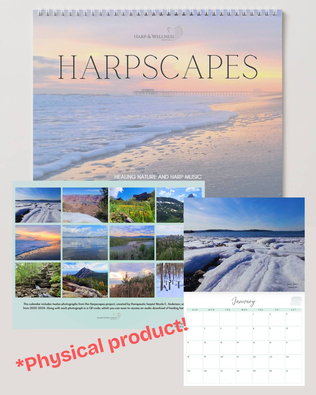 Find deep peace in 2026 with this calendar, which includes 12 nature visuals and accompanying music downloads from the Harpscapes Project. Each month showcases a peaceful nature image, along with a QR code, which you can scan to access the month's audio download. Product includes 5 downloads that are exclusive to this calendar and not featured on any other album!